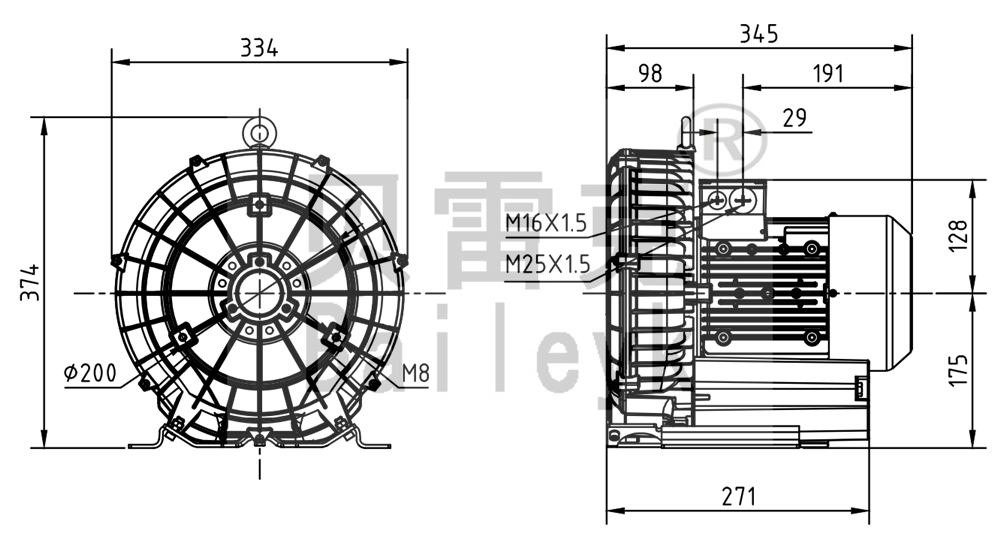 最大風(fēng)量:210m3/h 最大正壓:190mbar 最大負(fù)壓:200mbar 防護(hù)等級:IP55 噪音:64db 重量:23Kg